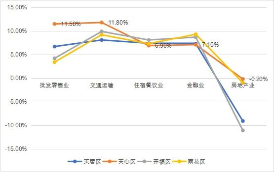 從增加值來看,天心區(qū)金融業(yè)為第一大產(chǎn)業(yè),占服務(wù)業(yè)的比重約為40%,說明天心區(qū)金融業(yè)在服務(wù)中地位顯著。批發(fā)零售業(yè)為第二大產(chǎn)業(yè),說明了“五一”商圈以及由此產(chǎn)生的商貿(mào)業(yè)存在較大影響力。