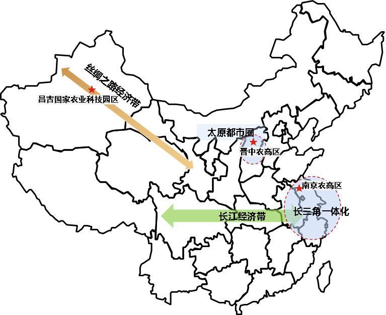 小結(jié):從區(qū)位條件來(lái)講,南京農(nóng)高區(qū)位于東部沿海發(fā)達(dá)地區(qū)和長(zhǎng)三角經(jīng)濟(jì)圈核心區(qū)域,與晉中農(nóng)高區(qū)、昌吉國(guó)家農(nóng)業(yè)科技園區(qū)相比,區(qū)位優(yōu)勢(shì)和國(guó)家戰(zhàn)略疊加效應(yīng)更加明顯。
