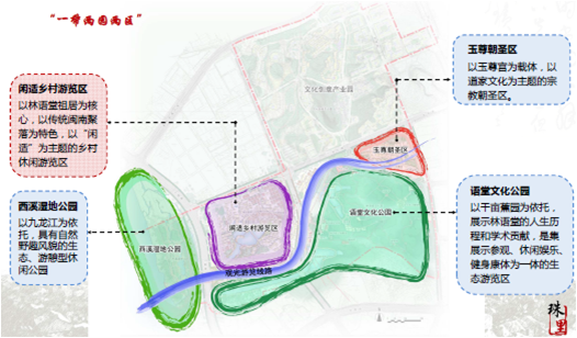 規(guī)劃思路:漳州市區(qū)西部景觀區(qū)的重要組成部分;以林語堂為核心品牌,集西溪濕地公園、林語堂文化園、文化創(chuàng)意產(chǎn)業(yè)園、珠里閑適村為一體的近郊文化休閑旅游目的地。文旅融合、景村聯(lián)動,以山水風(fēng)光、村落為依托,融入語堂文化,打造獨(dú)具特色的語堂文化品牌。 整治村莊環(huán)境,還原傳統(tǒng)韻味,村落與林語堂文化園、西溪公園及規(guī)劃文化創(chuàng)意產(chǎn)業(yè)園聯(lián)動開發(fā)。形成“一帶兩園兩區(qū)”的空間結(jié)構(gòu)。